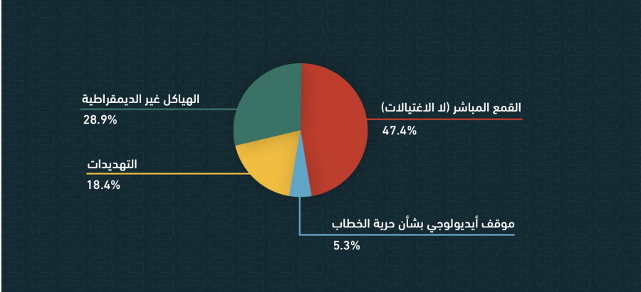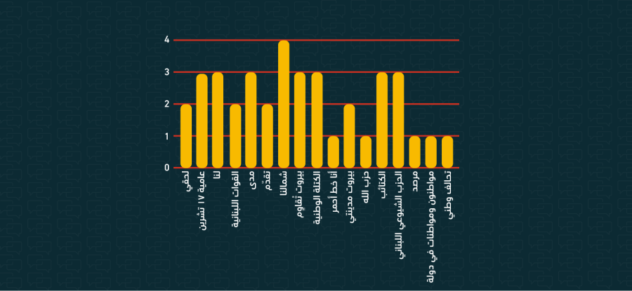 لكنّ البيانات تُظهر أيضاً أنّ 5.3% من التصريحات فقط، الصادرة عن مختلف الأحزاب السياسية، تعالج مسألة حرّية التعبير والديمقراطية من منظور متعلّق بالسياسات بشكل بحت. في المقابل، تُظهر التصريحات المنشورة بوضوح، من حيث طبيعتها ومحتواها، التحديات التي تواجه الأحزاب المعارِضة/ البديلة في مختلف المناطق، حيث يطغى شكل من "الاستبداد المحلي" على المشهد العام في المعاقل الحزبية المختلفة. ولعلّ أحد الأمثلة على ذلك العنف السياسي الذي أقدم عليه تيار المستقبل وحركة أمل ضد اللوائح والحملات المعارِضة للنظام، في طريق الجديدة في بيروت وبلدة الصرفند الجنوبية على التوالي، خلال الشهرين الماضيين.