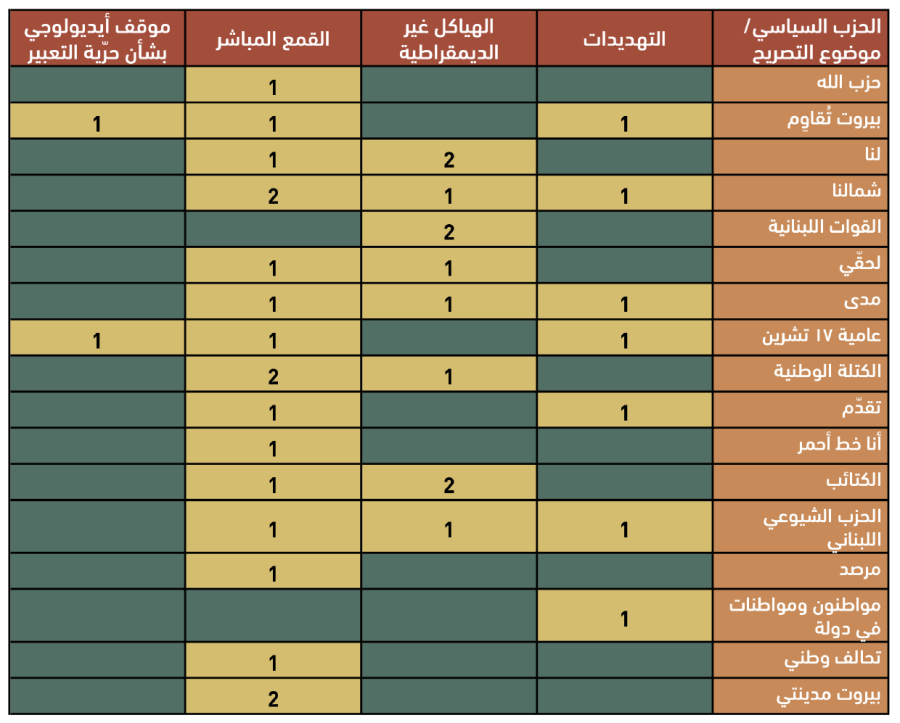 كما أظهرته التقارير الشهرية السابقة، توصّلنا إلى استنتاج متكرّر بأنّ الأكثرية الساحقة من التصريحات السياسية المتعلّقة بقضايا حرّية التعبير والديمقراطية، والصادرة عن الأحزاب السياسية اللبنانية، هي عبارة عن "ردود فعل"، تصبّ غالباً في خانة الردّ على الانتهاكات. بعبارة أخرى، لم يطّلع الجمهور، عبر منصّات هذه الأحزاب، على الكثير من المداخلات المميّزة والمبتكرة حول هذين الجانبين المحدّدين.