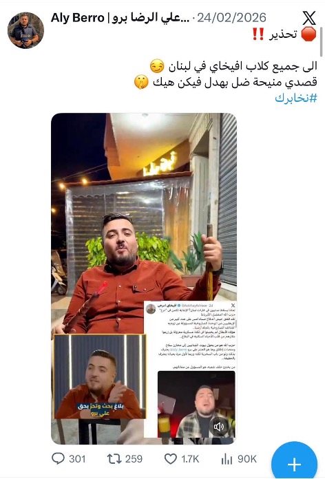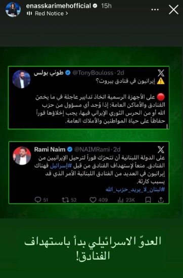 Recent online activity illustrates this dynamic clearly. Posts and stories circulated by prominent partisan voices and influencers have fueled a climate of fear, suspicion, and communal targeting. In one instance, rhetoric surrounding the alleged presence of Iranians in Beirut hotels was amplified in ways that linked rumor, wartime panic, and public alarmism. Such messaging does not need to contain an explicit threat to be dangerous. By framing certain people or groups as suspects, exposed, or blameworthy at a moment of war, it normalizes hostility and creates a permissive environment for escalation.