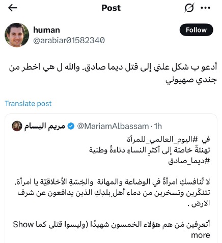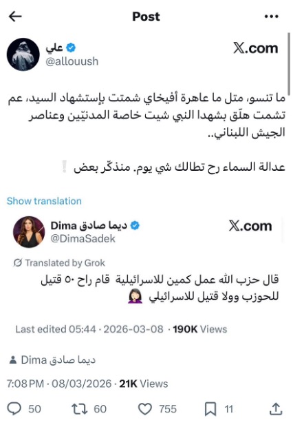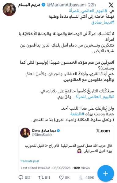 That escalation has also been visible in the attacks directed at journalist Dima Sadek. While Sadek is only one of several figures targeted in the current wave, the rhetoric used against her is particularly revealing. Public posts denouncing her have gone well beyond insult or political disagreement.