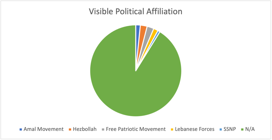 Out of the 122 analyzed accounts, 2.4% (3) showed affiliation with Hezbollah, 1.6% (2) showed affiliation with the Amal Movement, 1.6% (2) with the Lebanese Forces, 2.4% (3) with the Free Patriotic Movement, 0.8% or one account leaned towards the Syrian Socialist Nationalist Party, and 91% (111) did not exhibit any visible political affiliation.