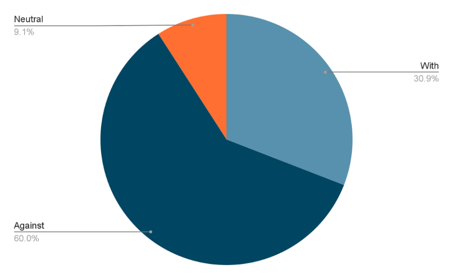 Out of 165 analyzed accounts, 60% (99) were against the narrative which portrayed the TV station as a victim of violation, while 30.9% (51) posted comments that condemned the actions of FPM supporters; most of which also expressed sympathy and support towards the TV station. And 9.1% (15) were neutral.