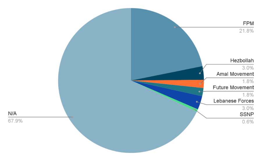 Out of the 165 analyzed accounts, 21.8% (36) showed affiliations with the Free Patriotic Movement, while 3% (5) showed affiliations with the Lebanese Forces (LF), which is equal to accounts showing affiliation to Hezbollah. Also, almost the same number of accounts showing affiliation with the Amal Movement and the Future Movement (FM) 1.8% (85) interacted with SKF’s post. Finally, 0.6% (1) of the interacting accounts showed affiliation with SSNP, while the rest showed no clear political affiliation but the content of their comments reiterated the discourse of the abovementioned political parties. Out of the 36 FPM-leaning accounts, all were against the victim of the violation and 30.5% (11) of the comments posted by FPM supporters contained hate speech. Whereas the FM- and LF-leaning accounts mainly condemned the actions of FPM supporters and linked the incident back to what they said were the party’s undemocratic practices during the turmoil that characterized former President Michel Aoun’s term in office. This highlights the fact that most of the interactions that were supportive of the victim of violation were, in fact, acting based on political grudges and not out of support for freedom of press and expression.