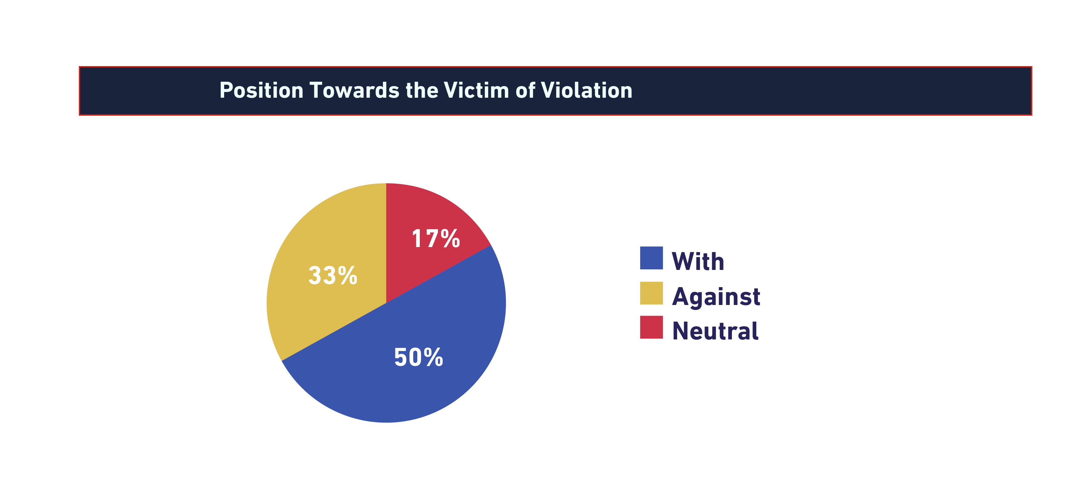 Out of the 54 analyzed accounts, 50% (27) were supportive of the journalist victim of violation, 33% (18) were against the journalist victim of violation, 17% (9) were neutral.