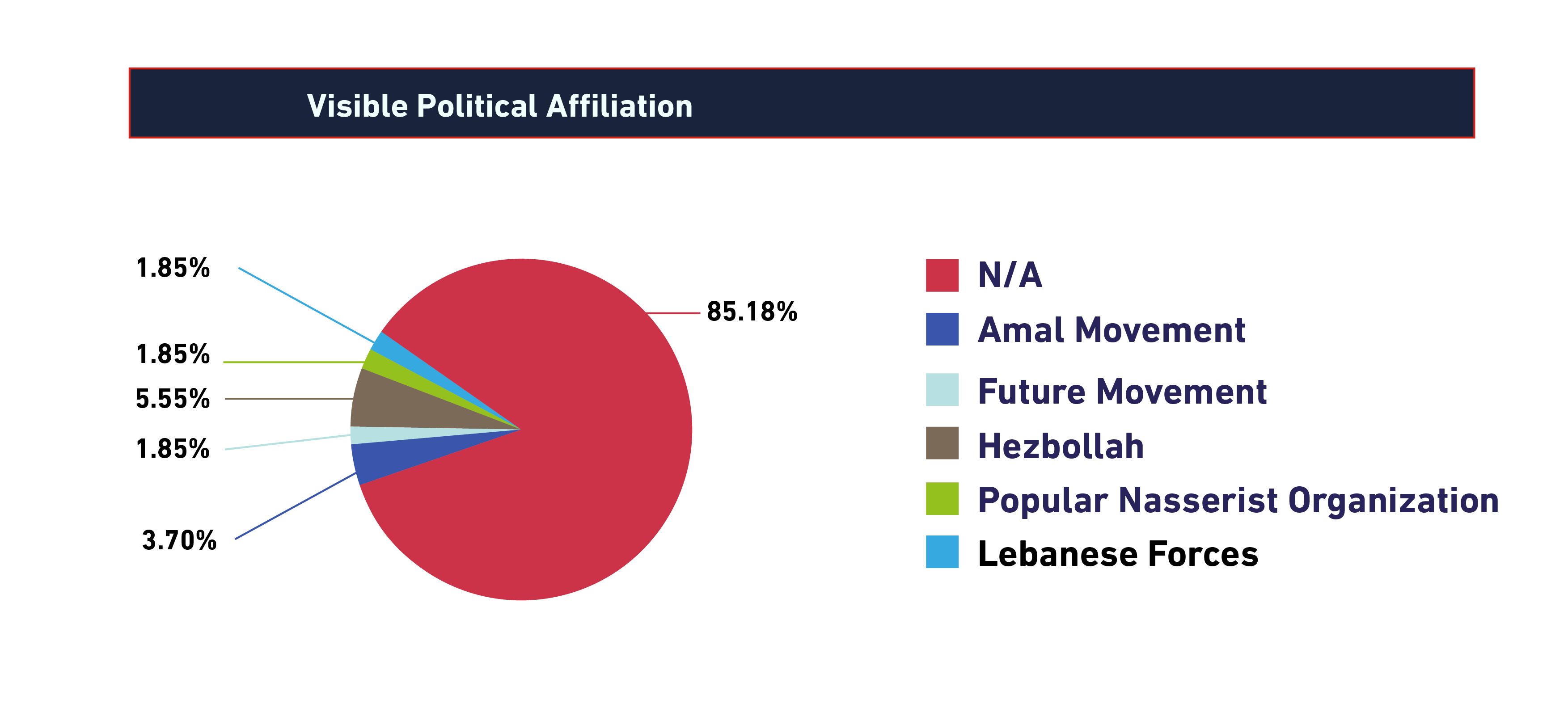 Out of the 54 analyzed accounts, 5.55% (3) showed affiliation with Hezbollah, 1.85% (1) person showed affiliation with the Future Movement, 1.85% (1) with the Lebanese Forces, 3.7% (2) with the Amal Movement, 1.85% (1) with the Nasserist Popular Organization, and 85.18% (46) did not exhibit any visible political affiliation.