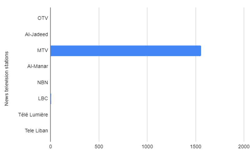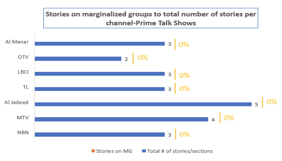 Seven prime time talk shows were monitored: And now what (Aljadded), Twenty 30 (LBCI), Lebanon Today (TL), Today’s Discussion (OTV), Talk of the hour (Al-Manar), The Fourth Estate (NBN), and It’s About Time (MTV).