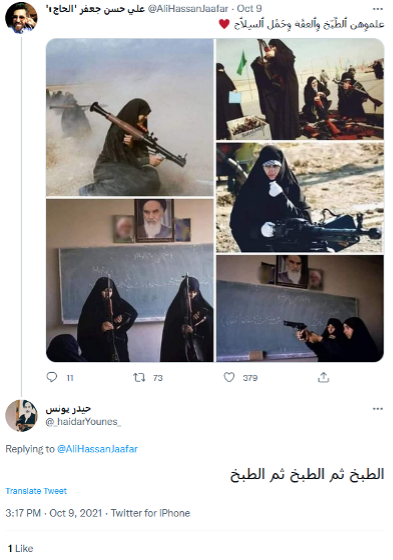 Nearly half of the problematic tweets came from accounts supporting Hezbollah. While they often tend to focus on either demonizing opposition, this month, a tweet went viral as it glorified warfare and bolstered harmful stereotypical constructs for women. In Img. 1 below, the author puts pictures of veiled Shiite women taking up arms and writes “teach them cooking, chastity, and how to use weapons.” The author also liked a tweet that responded, “cooking then cooking then cooking” (also in Img. 1). Women are still stereotyped and jokingly sidelined in society as such discourses remain unchallenged.