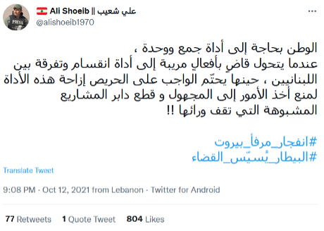 Img. 2: Tweet attempting to discredit Judge Tarek Bitar and accusing him of politicizing the port explosion investigation.