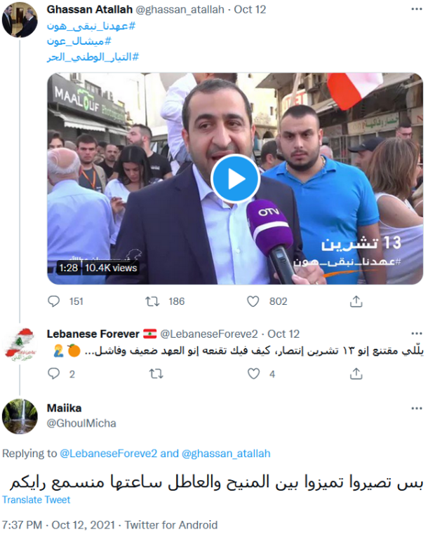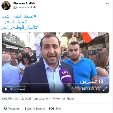 Additionally, the Free Patriotic Movement (FPM) was equally among the most active groups on Twitter during this month. This is most clearly demonstrated in the tweet of former FPM minister Ghassan Atallah in Img. 3 below. In the tweet, Atallah posts a video talking about the FPM-led protests the next day, calling out all those who oppose them as “enemy agents” and demonizing them, further spreading inflammatory rhetoric. The protests commemorated October 13, 1990, when the Syrian regime troops invaded the presidential palace, forcing General Michel Aoun to seek refuge at the French embassy in Beirut towards the end of the Lebanese civil war. FPM supporters called this a symbol of General Aoun’s resistance and refusal to endorse the Taif Agreement. It is also worth noting that FPM supporters likely overtook Hezbollah this month, even if the above charts show otherwise. That is because the statistics section of this report does not count the number of likes, comments, retweets, etc. Regardless, it gives a general holistic look at how trends and discussions occur.